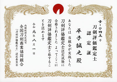 We have been certified as a sword evaluation expert by the national sword commercial cooperative.